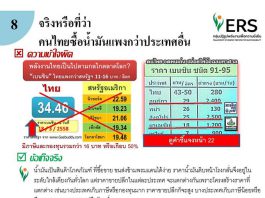 ข้อเท็จจริงที่มักไม่มีการพูดถึงในสังคมโซเชียลคือ ประเทศไทยใช้น้ำมันดีเซลวันละ 60 ล้านลิตร รัฐบาลเคยคุมราคาไม่ให้เกิน 30 บาทต่อลิตร ซึ่งราคาถูกกว่าประเทศในอาเซียน 7 ประเทศ แต่ไม่เคยนำมาบอก แต่กลับนำเบนซิน 95 ที่ใช้เพียงวันละ 1 ล้านลิตร ซึ่งมีการเก็บภาษีและกองทุนในอัตราที่สูงมากเป็นพิเศษ มาสร้างกระแสว่าคนไทยซื้อน้ำมันแพงกว่าประเทศอื่น